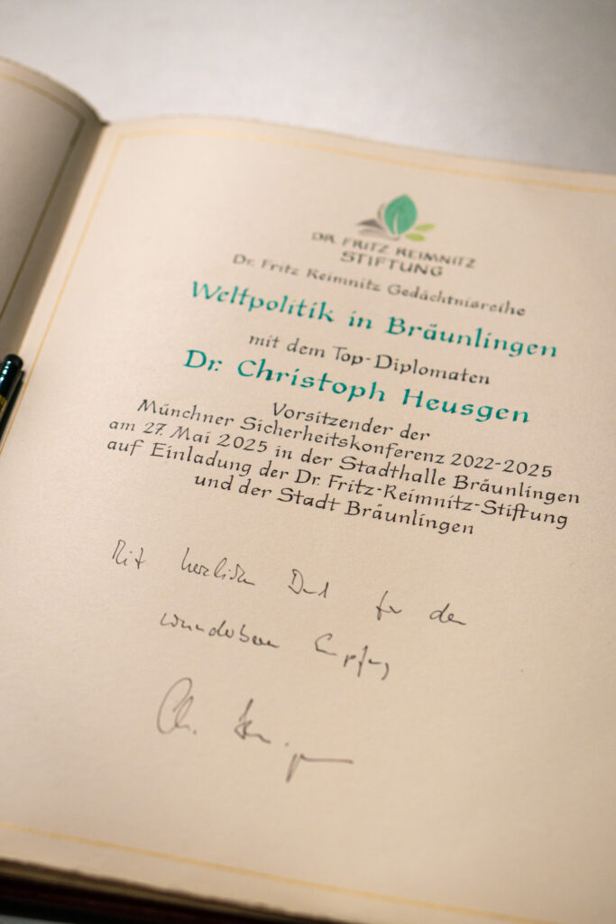 Die Dr.-Fritz-Reimnitz-Stiftung dankt Dr. Heusgen für seine Zeit und seinen Beitrag sowie der Stadt Bräunlingen für die gute Zusammenarbeit. Der erfolgreiche Auftakt unterstreicht die Bedeutung eines fundierten Austauschs über außen- und sicherheitspolitische Fragen in herausfordernden Zeiten.